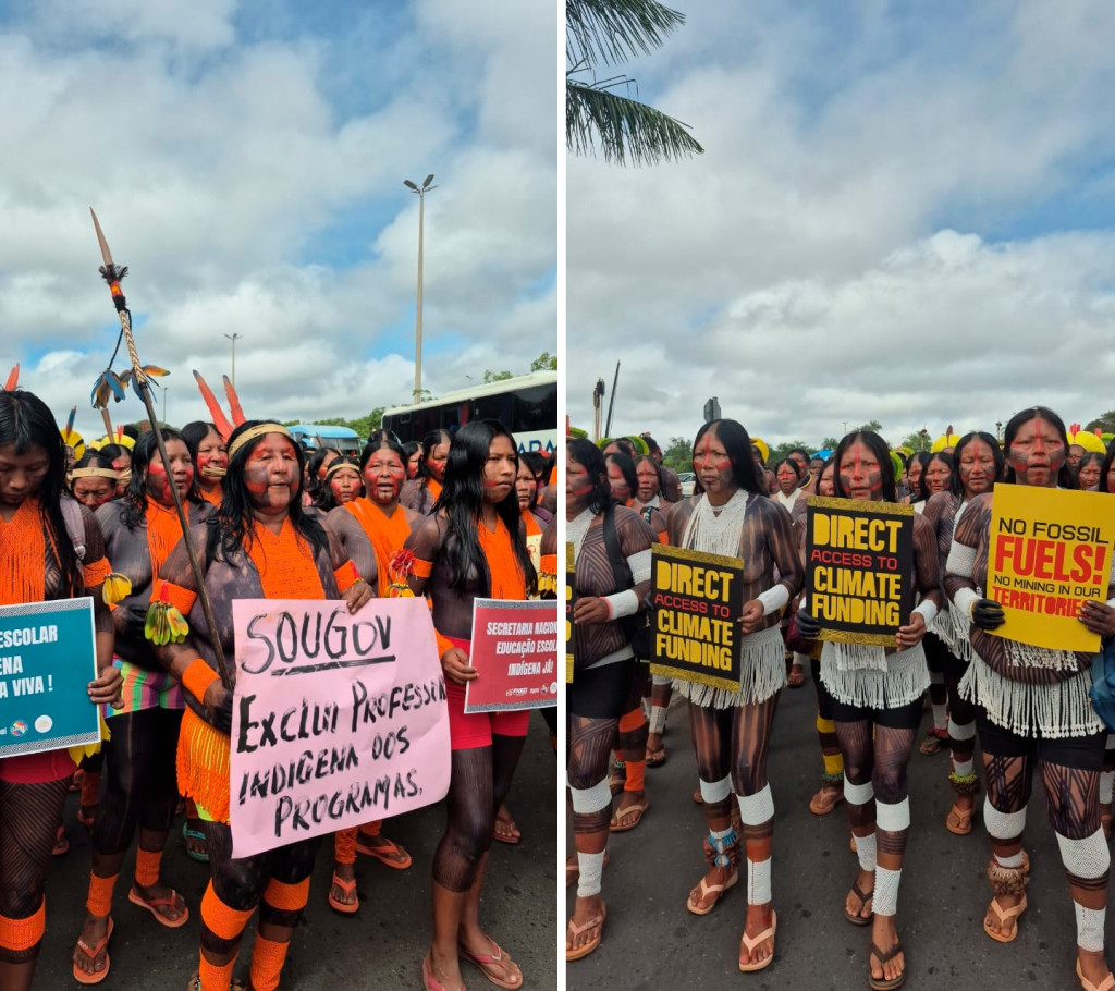 The march featured various ethnicities wearing traditional garments, body paint with urucum and jenipapo, and chanting throughout the entire journey from the Funarte headquarters, in Brasília, to the National Congress. Xikrin men and women, from the municipality of Parauapebas-PB, carried signs in defence of indigenous education, while the Xavante held up signs also in English demanding access to climate financing funds and opposing fossil fuels.