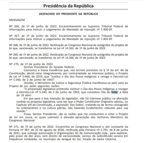 The date is celebrated on April 19th. In the veto, published in the Official Journal (DOU) on Thursday, 2, Bolsonaro claimed that “there is no public interest in the change”, since the Constitution already contains the current nomenclature, so it is already a “term enshrined in the national legal system and culture, with no robust grounds for its revision”.