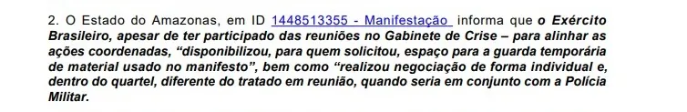 “The Brazilian Army, despite having participated in meetings in the Crisis Cabinet – to align the coordinated actions, ‘made available, to those who requested it, space for the temporary storage of material used in the manifesto’, as well as ‘conducted negotiations individually and, inside the barracks, different from what was dealt with in the meeting, when it would be in conjunction with the Military Police,” says the decision.