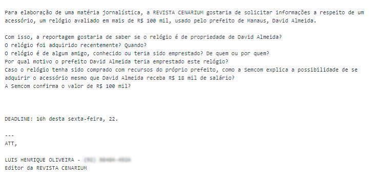 CENARIUM MAGAZINE keeps the confidentiality of the source of the information provided about the accessory used by the mayor of Manaus, as provided in Section XIV of Article 5 of the Federal Constitution.