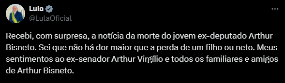 On the X network, Lula said he had received the news with surprise and showed support for the former senator, as well as Arthur Bisneto’s family and friends. “I know that there is no greater pain than the loss of a son or grandson. My condolences to former senator Arthur Virgílio and all of Arthur Bisneto’s family and friends” he said.