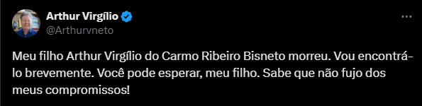 Arthur Bisneto’s father, Arthur Virgílio Neto, confirmed the information via his X account, lamenting the loss of his son. “My son Arthur Virgílio do Carmo Ribeiro Bisneto has died. I will meet him soon. You can wait, my son. You know I don’t run away from my commitments!” he wrote.