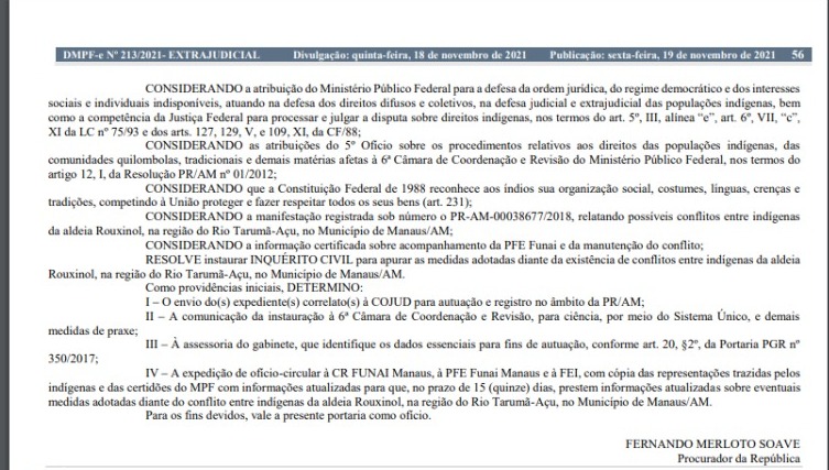 According to the publication, the organizations cited in the document should send a circular letter with copies of the representations presented by the indigenous people and the MPF certificates with updated information about any measures adopted in the face of the conflict.