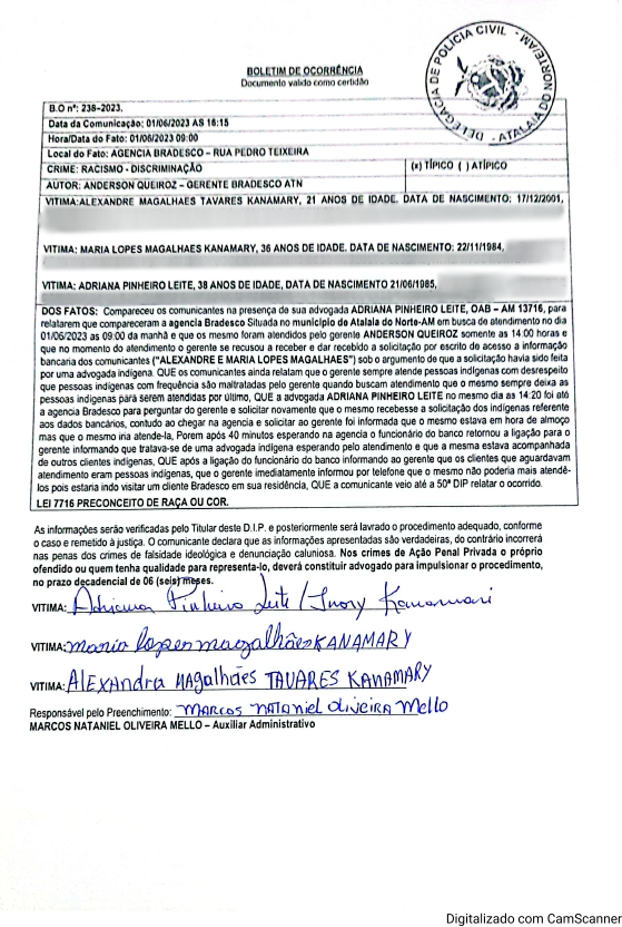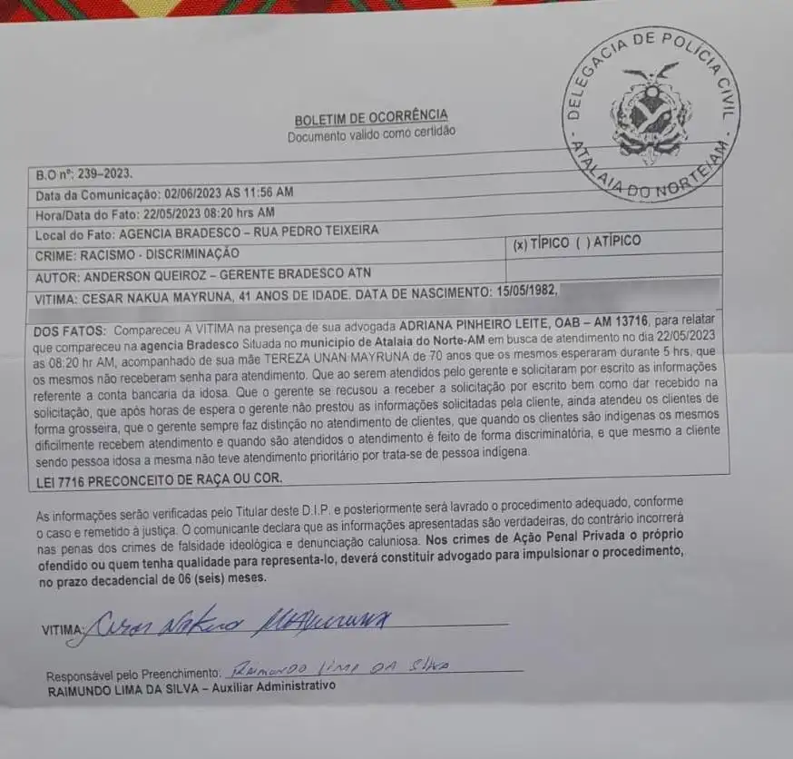 On May 22, the town councilman, César Nakua Mayuruna, 41, from the Mayuruna ethnic group, went to the Bradesco branch at around 8:20am, accompanied by his mother, a 70 year old woman, to help her in her search for assistance. After about five hours of waiting, they were attended to by the manager, who also refused to receive a written request that asked for access to bank data.
