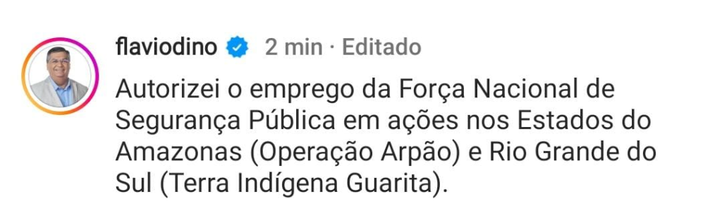 “I authorized the employment of the National Security Force in actions in the States of Amazonas (Operation Arpão) and Rio Grande do Sul (Indigenous Land Guarita)”, posted Flávio Dino, complementing that, in the Amazon, police officers will support the fight against organized crime, drug trafficking and environmental crimes.