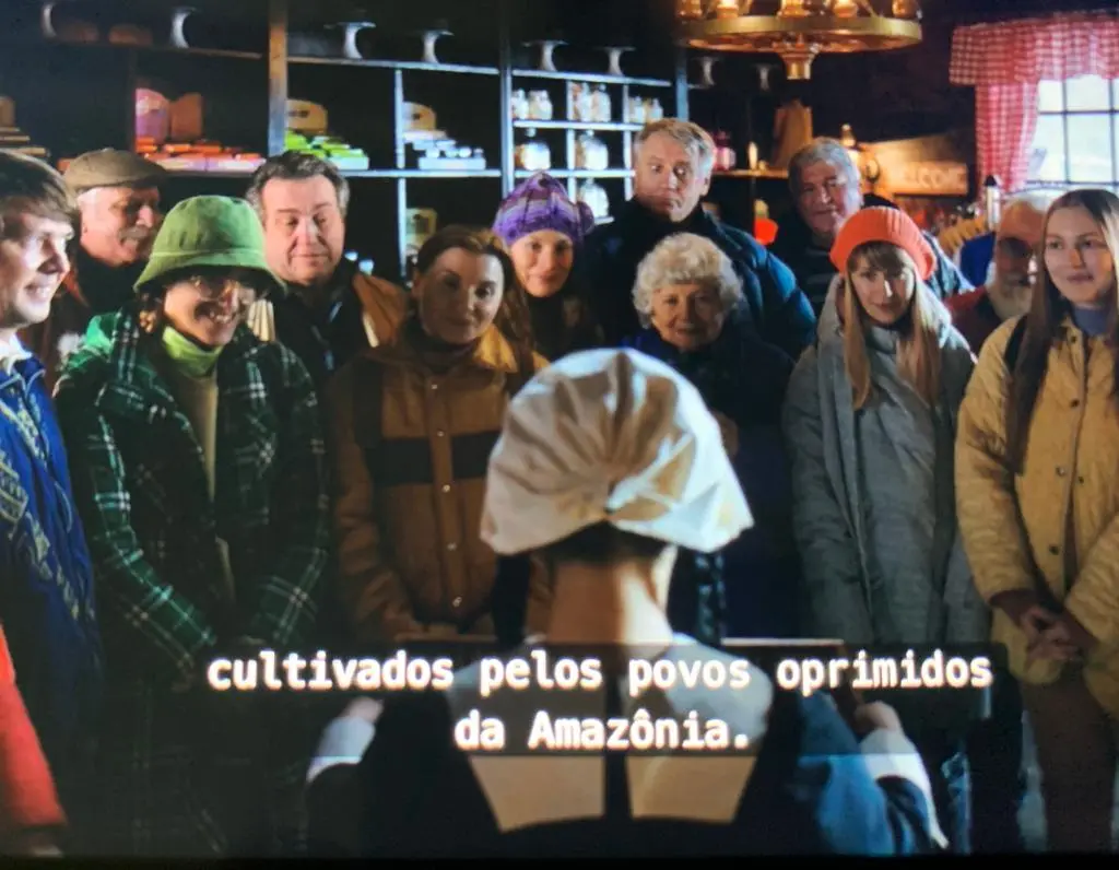 In the scene, customers enter the lounge of the shop and Wandinha dressed in a costume that refers to the North American colonial period, begins to explain about the delicacy that will offer the public. In a sarcastic tone, she talks about the geographic origin and oppression of the product. Astonished by the information, the public not only rejects the sweet, but leaves the establishment in mass.