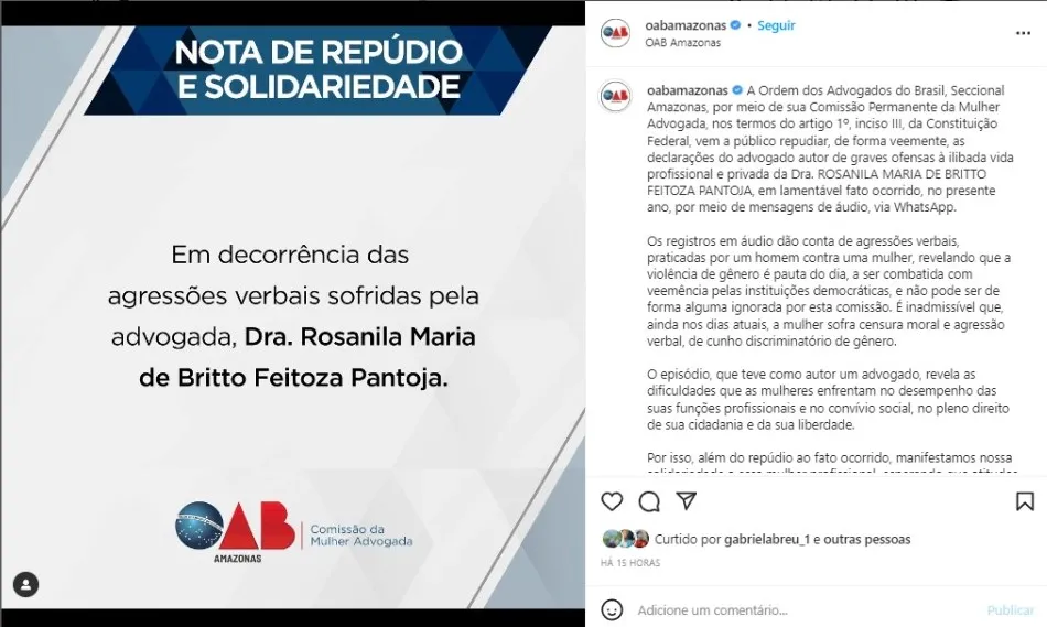 The Brazilian Bar Association, Amazonas Section, through its Standing Committee of Women Lawyers, in accordance with Article 1, section III, of the Federal Constitution, publicly repudiates, vehemently, the statements of the lawyer author of serious offenses to the unblemished professional and private life of Dr. ROSANILA MARIA DE BRITTO FEITOZA PANTOJA, in a regrettable fact occurred this year, through audio messages, via WhatsApp.