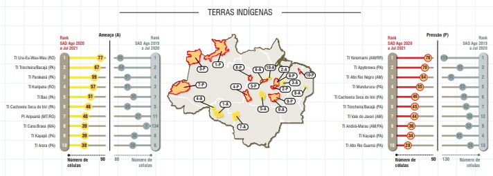 Among the Indigenous Lands (TIs), the Yanomami, located in the Amazonas and Roraima, was the one with the highest number of occurrences within its territory, that is, the most pressured between August 2020 and July 2021. This year, the area was the target of attacks by miners, which motivated legal actions for protection.