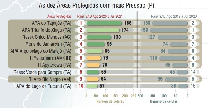 MANAUS and BRASÍLIA – Pará is the Amazon State that had the most protected areas – such as indigenous lands, quilombola territories and conservation units – pressured and threatened in one year. Seven of the ten most pressured areas and five of the ten most threatened areas in the Amazon are located in the state. Among all the protected areas, the Tapajós APA, a federal conservation unit also in Pará, was the most pressured.