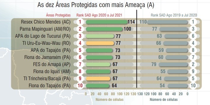 In the ranking of pressured protected areas, after APA Tapajós, is the Pará state conservation unit APA Triunfo do Xingu and Resex Chico Mendes, a federal conservation unit in Acre. The Resex also topped the list of all the most threatened protected areas in the Amazon. It was followed by the Parna Mapinguari, a federal unit that is in Amazonas and Rondônia, and the APA do Lago de Tucuruí, a state conservation unit also in Pará.