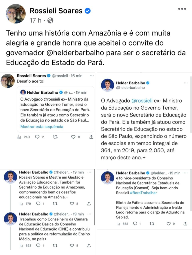 “He worked as a counselor of the Basic Education Chamber of the National Education Council (CNE) and contributed to the policy of reformulation of secondary education in the country, and was vice president of the National Council of State Secretaries of Education (Consed). Welcome Rossieli #BoraTrabalhar”, (‘Let’s work’ in english), wrote the governor of Pará.