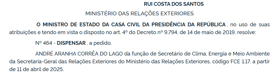 The position of Secretary for Climate, Energy and Environment of the General Secretariat for Foreign Affairs had been held by the ambassador since March 2023. The ordinance indicates that the resignation was backdated to 11 April 2025. The Ministry of Foreign Affairs’ press office reported that André Corrêa do Lago’s departure was necessary because he cannot hold two positions simultaneously within the federal administration. See the decree that made the secretary’s resignation official: