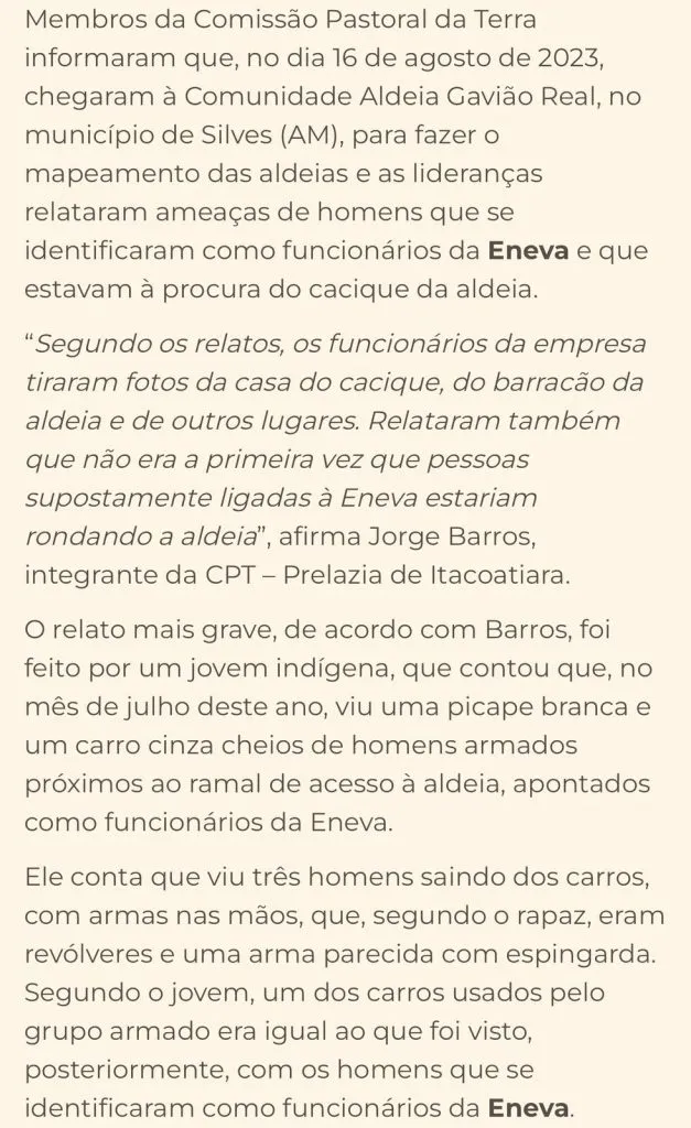 “It’s unfortunate that we can’t stay on our land without a (police) escort. It’s a totally different life not being able to have the freedom we had before, to fish, to hunt, to do what we liked”. The statement comes from the chief of the Gavião Real I village, Jonas Mura, who is in the Program for the Protection of Human Rights Defenders (PPDDH), following threats from Eneva employees.