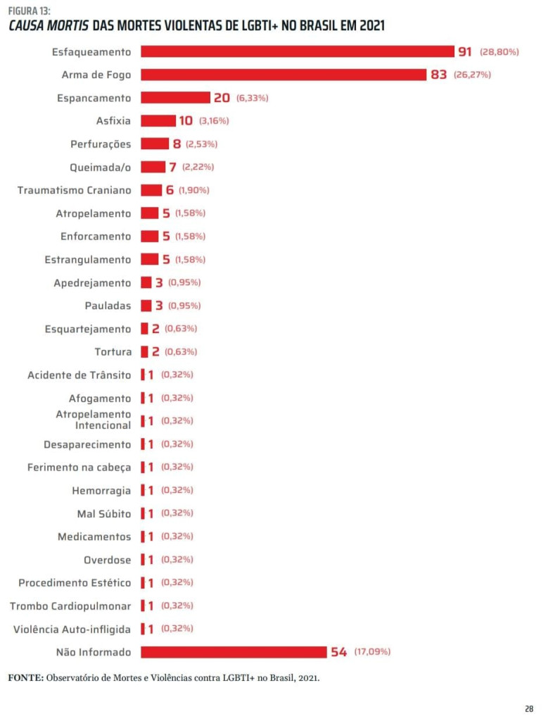 The document is the result of a collective work of production and systematization of data among institutions, such as Acontece Arte e Política LGBTQIA+, the National Association of Transvestites and Transsexuals (Antra), and the Brazilian Association of Lesbians, Gays, Bisexuals, Transvestites, Transsexuals and Intersex (ABGLT). According to the text, of the 316 deaths, 285 were murders, 26 suicides and 5 from other causes.
