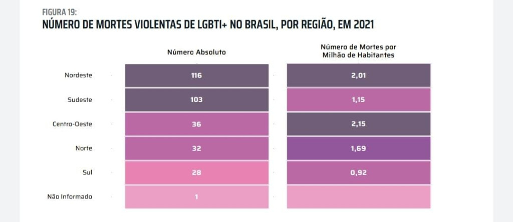 The study, carried out by the Observatory of Deaths and Violence against LGBTQIA+, coordinated by Acontece, by the Gay Group of Bahia (GGB), was based on the report concluded in 2020 and on the partial survey referring to the period from January to September 2021, and brings a more detailed dossier, although it still considers the data referring to the subject underreported, in Brazil, and, therefore, it also counts on the help of news published in newspapers, portals, websites and other communication vehicles.