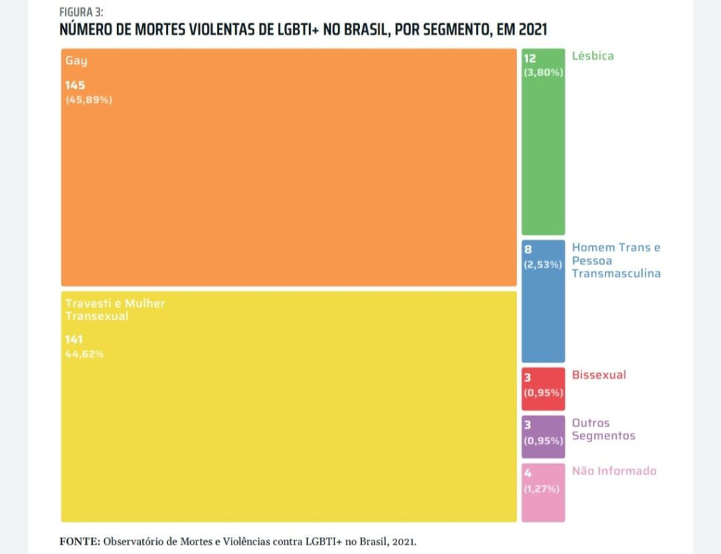 According to the report, every 27 hours an LGBTQIA+ person was murdered in Brazil in 2021. The publication also informs a percentage that identifies the various types of violence against the LGBTQIA+ population. In terms of homicides, the 262 registered cases represent 82.91% of the total; in terms of armed robbery, the 23 cases correspond to 7.28% of the registered cases. When added together, homicides and robberies add up to 90.19% of violent deaths.