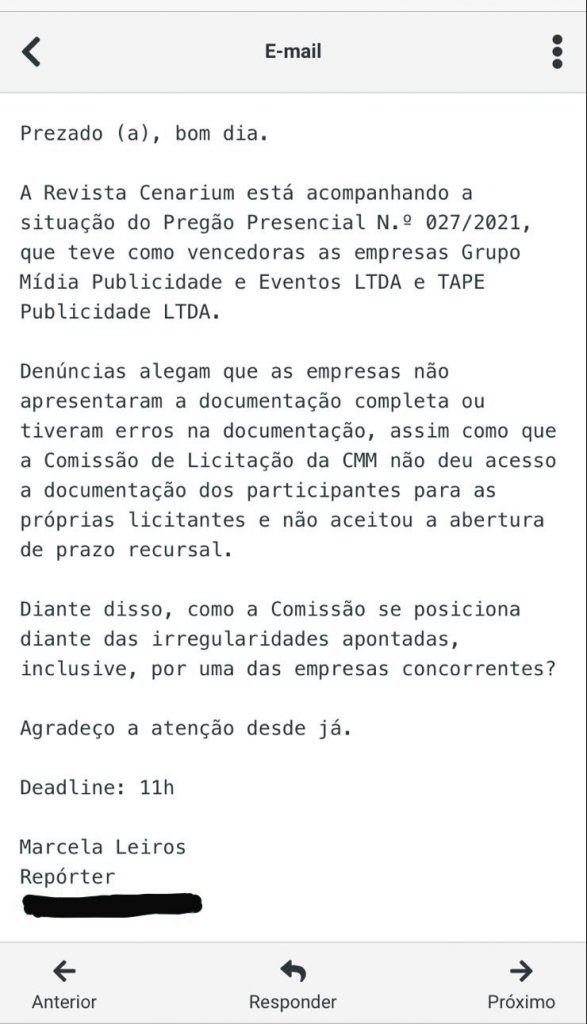 The report asked the CMM and Tape Agency about the suspicion of directionality in the bidding, but, until the publication of this report, there was no answer. Tessa Mídia, the nickname for the Grupo Mídia company, affirmed that the documentation was all correct, but did not give any further details.