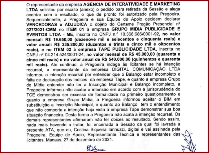 MANAUS – The bidding process that resulted in the concession to two communications companies to provide advertising and marketing services to the City of Manaus (CMM), amounting to almost $ 800 thousand, became the target of suspicion of targeting, ie, favoritism of the winners. The Legislative House held on Monday, 27, the Presential Auction No. 027/2021 and the winners were the companies Grupo Mídia Publicidade e Eventos Ltda. and Tape Publicidade Ltda.