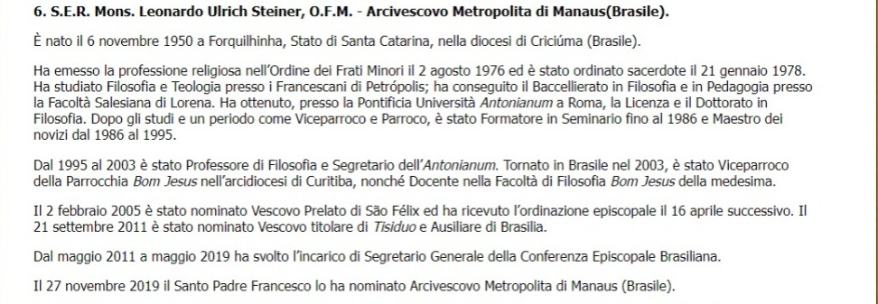 Leonardo Steiner is a Franciscan (appointed bishop by Saint John Paul 2), he was secretary general of the National Conference of Bishops of Brazil (CNBB) for two terms, appointed auxiliary bishop of Brasilia by Benedict 16, and Archbishop of Manaus by Pope Francis. He was born on November 6, 1950, in Forquilhinha, state of Santa Catarina.