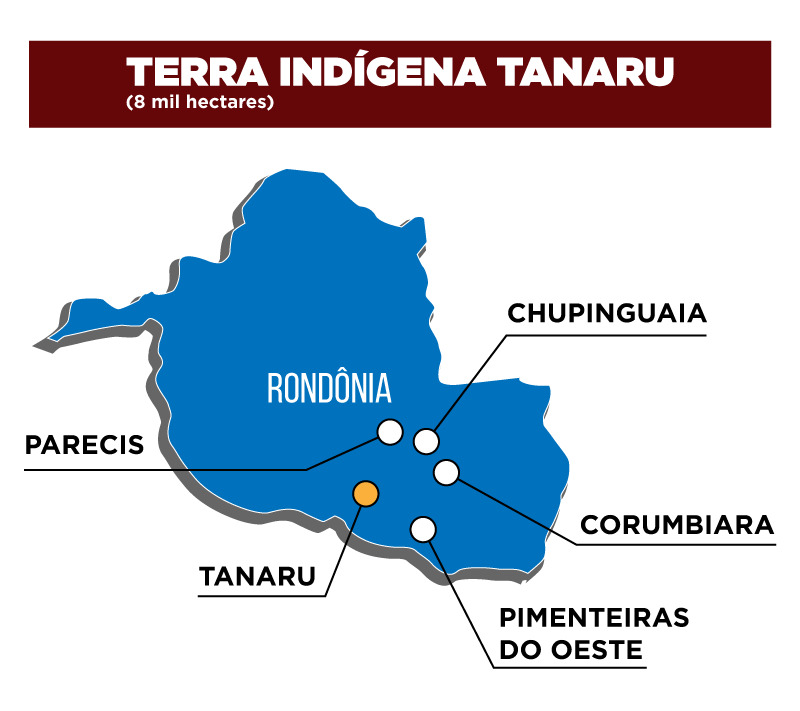 Protected by use restriction ordinances from Funai, the Tanaru land is divided between four municipalities: Corumbiara, Chupinguaia, Parecis and Pimenteiras do Oeste. The place is surrounded by many cattle ranches and suffers great pressure from cattle ranchers and politicians. Funai has not yet informed what it will do with the region.