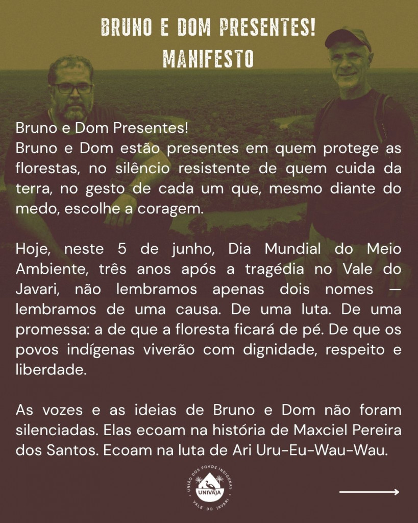“Today, this June 5, World Environment Day, three years after the tragedy in the Javari Valley, we do not remember only two names — we remember a cause. A struggle. A promise: that the forest will remain standing. That Indigenous peoples will live with dignity, respect, and freedom,” reads an excerpt of the manifesto. (See the full manifesto below)