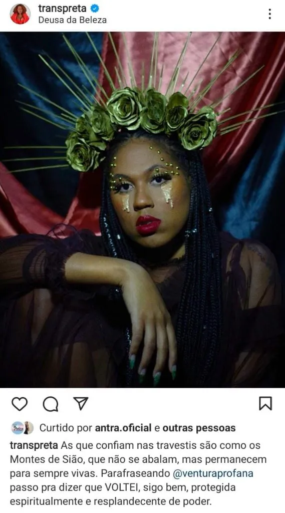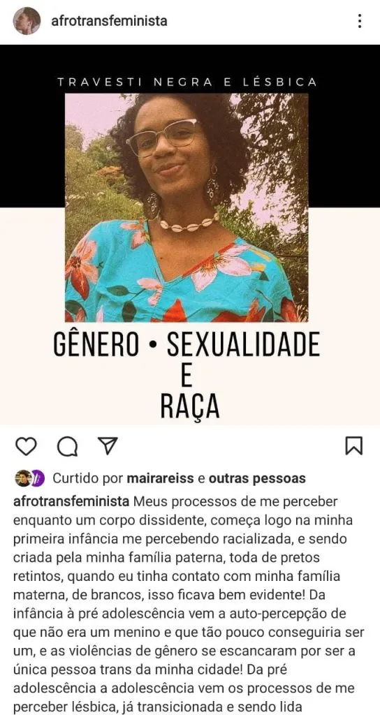 Writer Dandara Maria also addresses the topic of gender and sexuality. Presenting herself on social media as a black, trans, and lesbian woman, the Afrotransfeminista shares posts and writings about race and the importance of building a black transfeminism. Dandara reinforces the need for the recognition and value of trans voices to be heard and to occupy the most varied spaces in society.
