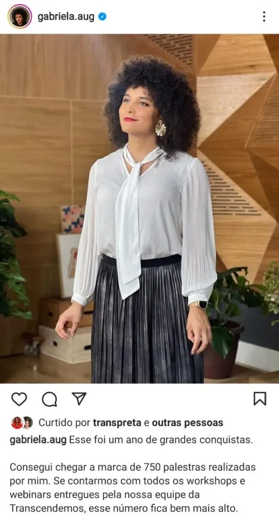 Founder of Transcendemos, a consulting company that promotes diversity and inclusion in organizations, Gabriela Augusto is graduated in Law and author of the book “Empresa de Respeito Manual”. Gabi uses the platforms to talk about inclusion, plurality, and to promote awareness about the need to integrate trans people in the labor market.