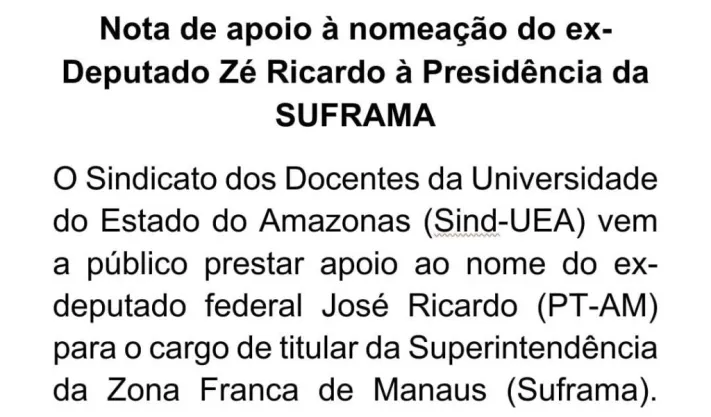 According to the secretary of Communication and member of the board of directors of Sind-UEA, Ceane Simões, the note of support to José Ricardo to superintendency of Suframa meets a demand of the union base that understands that, besides the technical prerogatives, the former deputy presents special conditions from the political point of view.