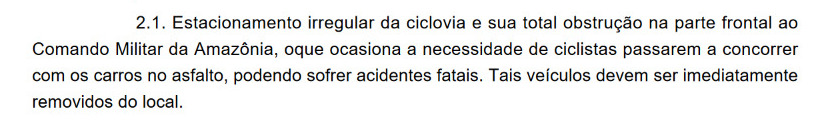 The magistrate also holds the Government of Amazonas and Manaus City Hall responsible for any traffic accident that happens because of the irregular occupation of the existing bike path area in place.