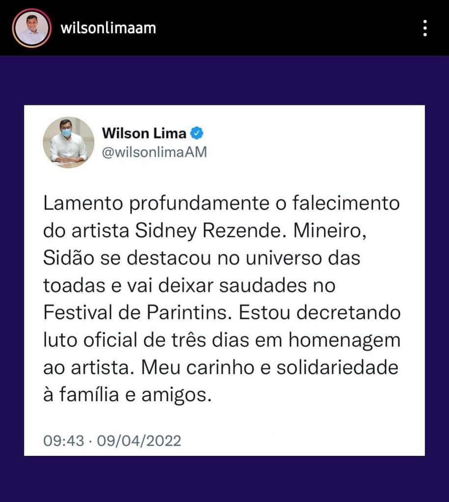 On his social networks, Wilson Lima deeply regretted the death of Sidney, known to his friends as “Sidão”, and highlighted his contribution to the musical universe of the toadas of the bois-bumbás of Parintins.
