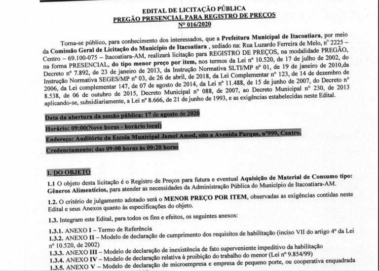 Quanto aos itens, as compras são destinadas às secretarias de assistência social e saúde. São órgãos que tem prestado assistência às famílias nesse período de pandemia.