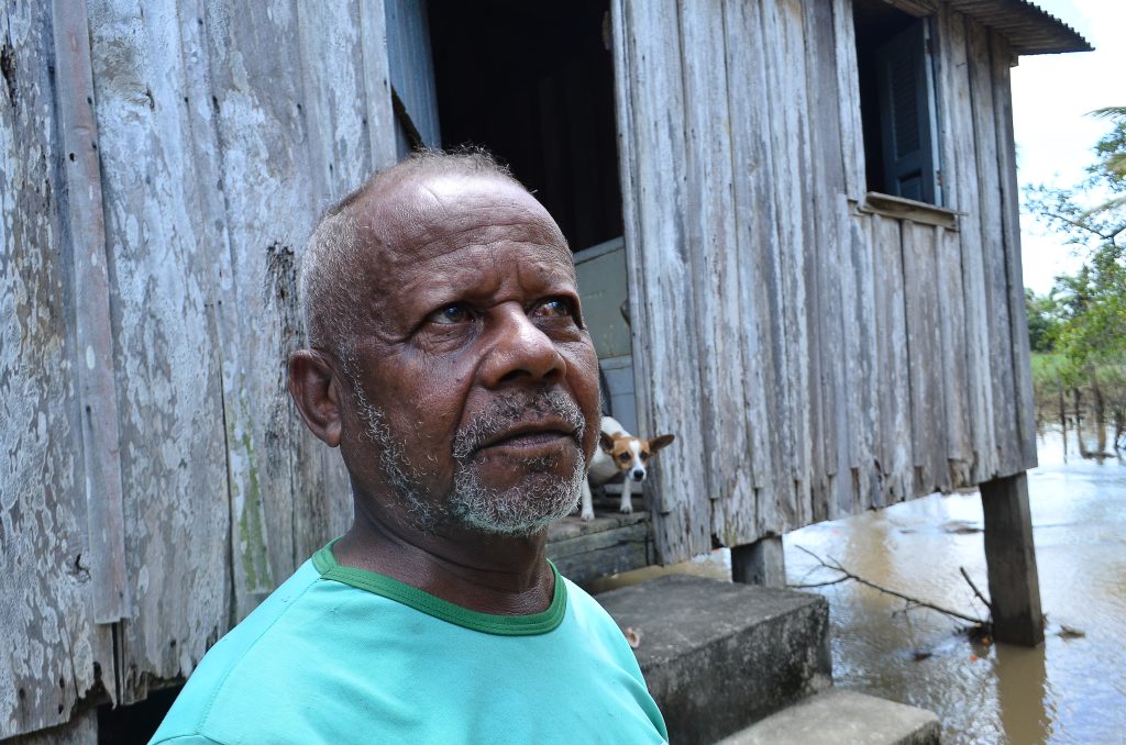 Antônio Carlos Leal dos Santos, de 67 anos, mora na região de Barreirinha há 20 anos. É casado com Geni Afonso Rosa, de 75 anos. Quando tudo aconteceu, Geni já estava na casa que eles têm na cidade de Canavieiras. Ela saiu de casa quando a inundação cobriu parte da cozinha que fica atrás de sua casa. A marca da água mostra que o volume chegou até a metade da estrutura. Ele ficou para organizar a coleta de ‘goiamon’ para a venda mensal. A água começou a subir e seu Antônio decidiu salvar seu gado, suas galinhas, perus e seus cachorros. Ele mediu a altura da água a partir de sua escada na entrada da casa. Quando percebeu que a água estava dentro da casa, ele pediu ajuda para os amigos que moram próximos.