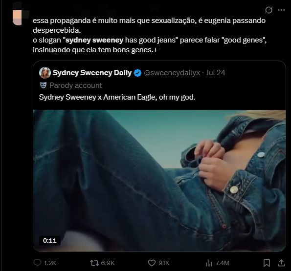 MANAUS (AM) – A atriz Sydney Sweeney, conhecida por seu trabalho em séries como “Euphoria”, teve o nome associado a uma campanha publicitária que gerou controvérsia. A publicidade foi alvo de críticas por uma possível alusão à eugenia, teoria pseudocientífica que propõe a “melhoria” da espécie humana por meio de práticas seletivas, frequentemente relacionada a questões raciais e discriminatórias.