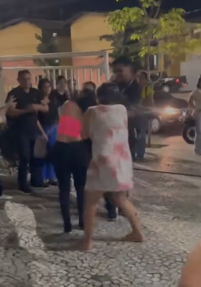 Imagens registradas e compartilhadas por testemunhas mostram o momento em que a mãe do funcionário — que estava trajando um vestido florido — afirma que a aluna — que aparece usando uma blusa rosa — havia chamado o filho dela de “macaco” e, por isso, estaria agredindo a mulher.