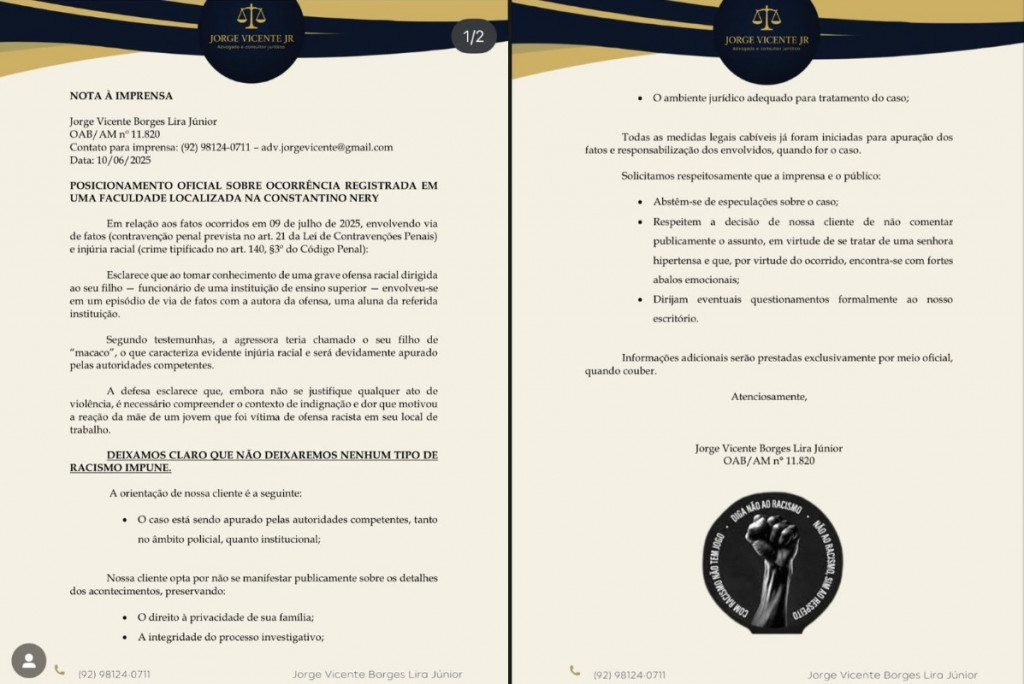 Em nota, o Centro Universitário Fametro repudiou as agressões e qualquer ato racista. De acordo com o comunicado emitido pela universidade, os responsáveis estão apurando o caso e devem ouvir as partes envolvidas. Após isso, as medidas cabíveis devem ser tomadas. (Leia a íntegra ao final da matéria).