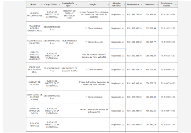 Os três juízes que receberam os maiores subsídios foram: Glauco Antônio Alves (R$ 1,19 milhão líquido), diretor do foro de 2ª entrância lotado no Juizado Especial Cível e Criminal da Comarca de Ouro Preto do Oeste, município com 35 mil habitantes situado a 340 quilômetros de Porto Velho; Francisco Borges Ferreira Neto (R$ 1,1 milhão líquido), desembargador da 2ª Câmara Criminal; e Glodner Luiz Pauletto (1,09 milhão líquido), da 1ª Câmara Especial.