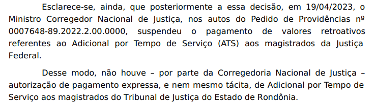 O Tribunal afirmou que os pagamentos foram “devidamente autorizados pelo Conselho Nacional de Justiça e também pelo Tribunal Pleno Administrativo de Rondônia“. O Conselho Nacional de Justiça, no entanto, ressaltou que o deferimento está suspenso para todos os Tribunais desde o segundo semestre de 2023. O órgão disse não ter encontrado, em sua base de dados, a autorização do benefício para a Corte de Rondônia.