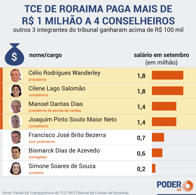 De acordo com site, o Portal da Transparência da instituição aponta que os conselheiros que receberam o maior valor bruto foram o presidente do TCE-RR, Célio Wanderley, com R$ 1,8 milhão, assim como a conselheira Cilene Lago Salomão, que também recebeu a mesma quantia. Em seguida aparecem Joaquim Pinto Souto Maior Neto e Manoel Dantas, ambos recebendo R$ 1,4 milhão.