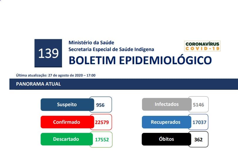 Veja o Boletim Epidemiológico da Sesai divulgado em 27 de agosto: