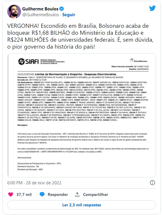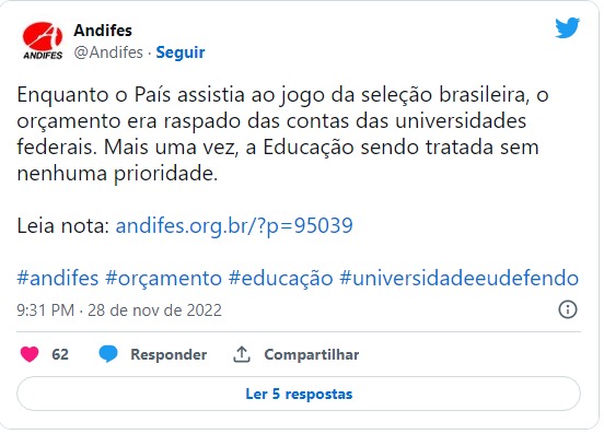 “Com surpresa e consternação e, praticamente, no apagar das luzes do exercício orçamentário de 2022, o orçamento para as nossas mais diversas despesas (luz, pagamentos de empregados terceirizados, contratos e serviços, bolsas, entre outros) era raspado das contas das universidades federais, com todos os compromissos em pleno andamento”, denunciou a Associação Nacional dos Dirigentes das Instituições Federais de Ensino Superior (Andifes).