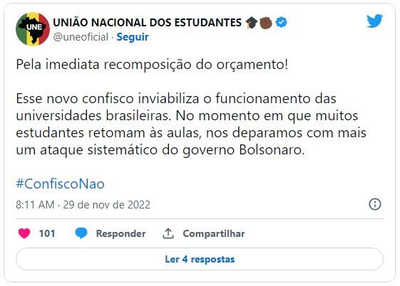 A União Nacional dos Estudantes (UNE) também se articula pela imediata recomposição do orçamento e mais um ataque sistemático do Governo Bolsonaro à educação.