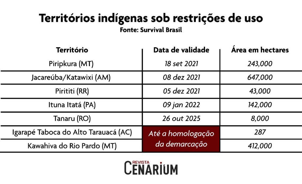 Segundo os movimentos de defesa dos povos indígenas, atualmente existem sete territórios sob restrições de uso e a maioria dessas restrições precisam ser renovadas, em média, a cada três anos. As restrições de uso das terras indígenas Piripkura, em Mato Grosso, Jacareúba/Katawixi, no Amazonas e Pirititi, em Roraima, expiram ainda este ano.
