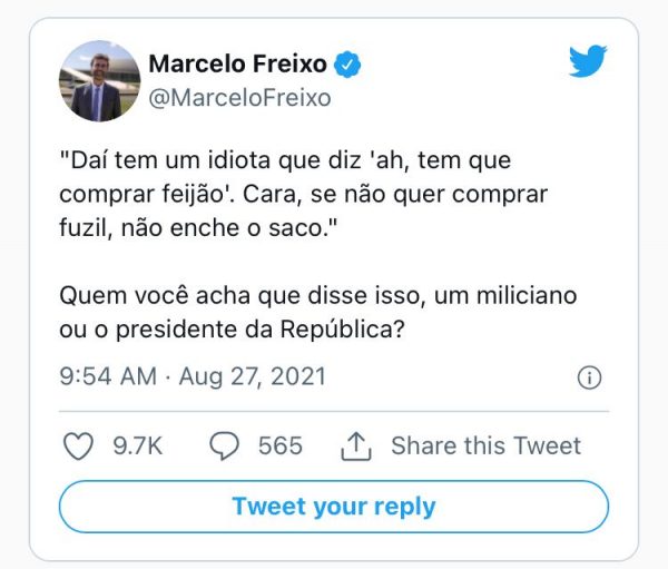 A postura do presidente frente ao assunto chegou a ser uma dos assuntos mais comentados no Twitter ainda na sexta-feira, 27. Figuras como o presidente nacional do partido Cidadania, Roberto Freire, fizeram uma postagem para repreender a fala do presidente. “Inacreditável termos um elemento na Presidência da República que sai dizendo estultices e idiotices como essa”, escreveu Roberto Freire.