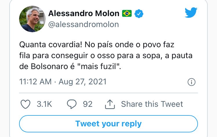 O parlamentar e líder da oposição na Câmara, Alessandro Molon (PSB-RJ), também se pronunciou sobre o assunto por meio das mídias sociais e classificou como “covardia” a frase de Bolsonaro pontuando a fome no País. “Quanta covardia! No País onde o povo faz fila para conseguir osso para a sopa a pauta de Bolsonaro é “mais fuzil”, reprendeu Molon em post no Twitter.