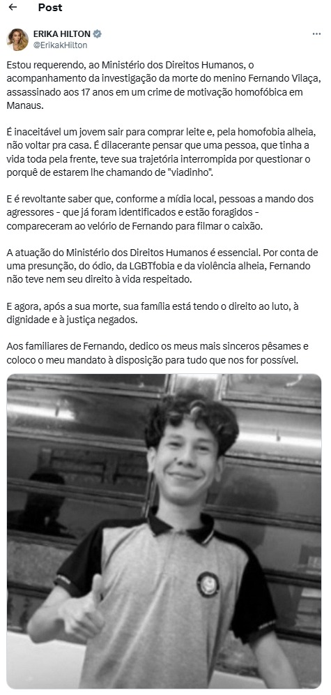 “Estou requerendo, ao Ministério dos Direitos Humanos, o acompanhamento da investigação da morte do menino Fernando Vilaça, assassinado aos 17 anos em um crime de motivação homofóbica em Manaus“, declarou a deputada. É dilacerante pensar que uma pessoa, que tinha a vida toda pela frente, teve sua trajetória interrompida por questionar o porquê de estarem lhe chamando de ‘viadinho'”, disse a parlamentar.