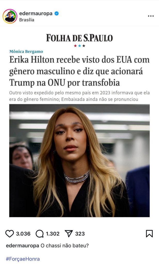 BELÉM (PA) – O deputado federal Éder Mauro (PL-PA) fez um comentário transfóbico nas redes sociais contra a deputada federal Erika Hilton (Psol-SP), após ela denunciar que teve sua identidade de gênero desrespeitada durante a emissão de um visto diplomático para os Estados Unidos. Em tom de deboche, o parlamentar bolsonarista publicou: “O chassi não bateu?”, em referência ao erro no gênero do documento oficial. A postagem foi publicada com uma imagem da matéria da Folha de S.Paulo sobre o ocorrido.