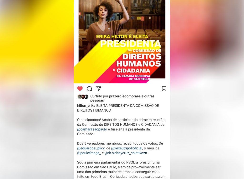 “Sou a primeira parlamentar do Psol a presidir uma Comissão em São Paulo, além de provavelmente ser uma das primeiras mulheres trans a conseguir esse feito em todo Brasil! Obrigada a todos que participaram, assinaram o abaixo assinado e torceram! É uma honra assumir a Comissão após o trabalho do querido Eduardo Suplicy (PT-SP)”, declarou Erika Hilton.