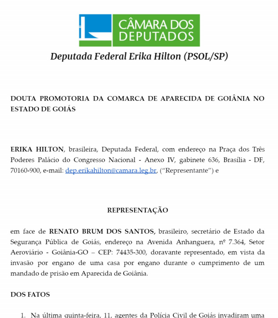 BRASÍLIA (DF) – A deputada federal Erika Hilton (PSOL) anunciou, por meio das redes sociais, que denunciou a Polícia Civil de Goiás pela invasão, por engano, a uma residência, na quinta-feira, 11. Segundo a parlamentar, o caso configura abuso e violência policial.
