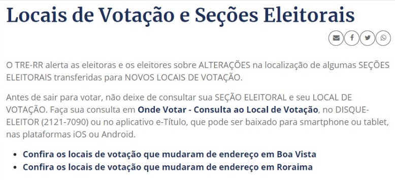 “A Justiça Eleitoral roraimense divulgará as alterações nos locais de votação de várias formas. A fim de evitar transtornos ao cidadão, foram confeccionadas faixas que serão colocadas nos antigos locais de votação para indicar onde irá funcionar a seção eleitoral. Também serão postados cards nas redes sociais do TRE para informar a população”, disse ao lembrar que é importante o eleitor verificar com antecedência o atual local de votação para evitar deslocamentos desnecessários no dia da eleição.