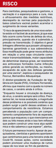 Até abril de 2021, 14.237.078 pessoas no Brasil tinham sido contaminadas com o vírus. Dentre elas, 386.416 perderam a vida para a Covid-19, 12.711.103 estão recuperadas e 1.139.559 ainda estão em acompanhamento. Até o final de abril, o País tem batido recordes diários de novos contaminados, no número de internados e mortes em decorrência da Covid-19 ou de suas sequelas. O mundo, de forma alguma, voltará a ser o mesmo. Mudamos os hábitos, adotamos novas medidas de controle e prevenção e diversos protocolos sanitários e médico-hospitalares, mas nada tem sido tão eficaz quanto a vacinação e o distanciamento social.